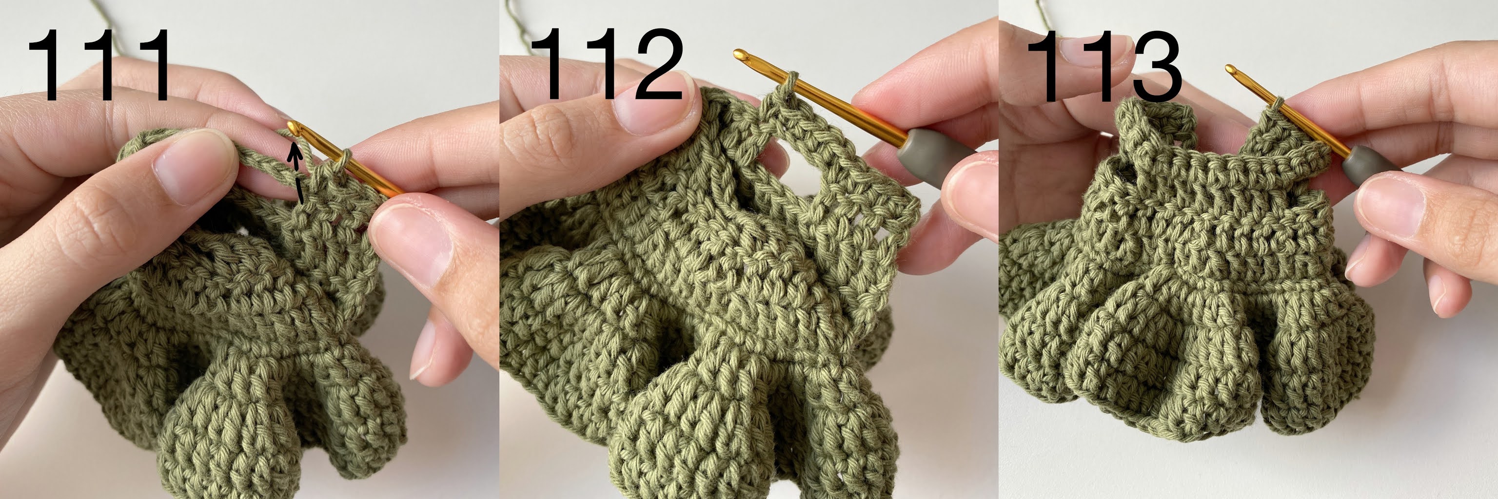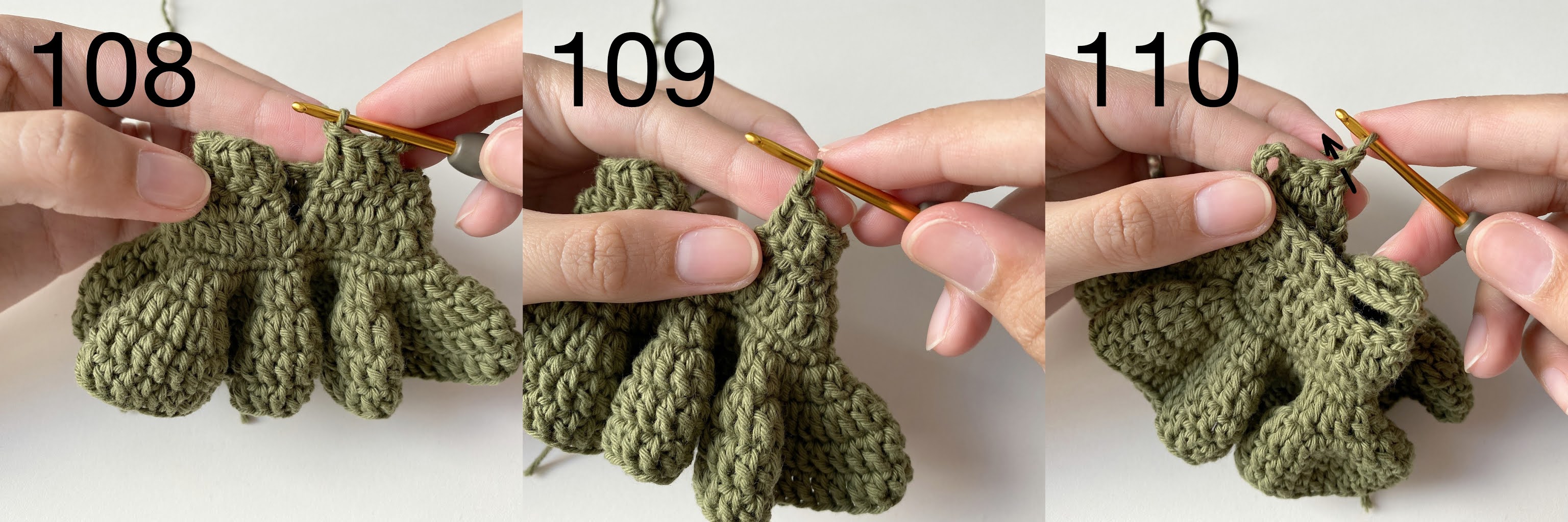 RND 1: (dc in next 4 ch, dec) * repeat 6 times [30] /pic.96-98/RND 2: Ch 2 /pic.99/, turn the detail /pic.100/, (dc in next 3 st, dec) * repeat 6 times [24] /pic.101-102/RND 3: Ch 2 /pic.103/, turn the detail /pic.104/, dc in next 4 st /pic.105/, 4 chains /pic.106/, skip next 4 st /pic.107/, dc in next 8 st, 4 chains, skip next 4 st, dc in next 4 st [24] /pic.108/RND 4: Ch 1 /pic.109/, turn the detail /pic.110/, sc in next 24 st [24] /pic.111-113/