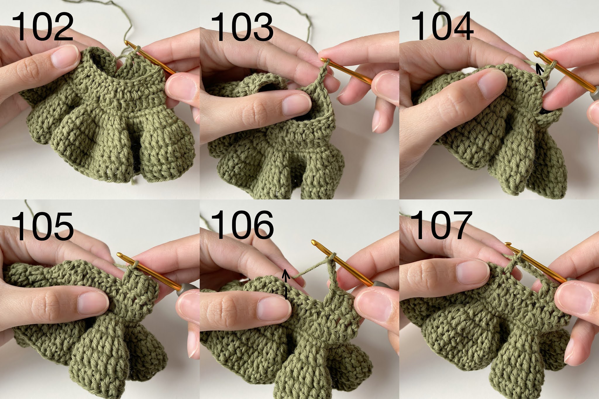 Attach the yarn to the ch of rnd 1 of the skirt. /pic.93-94/