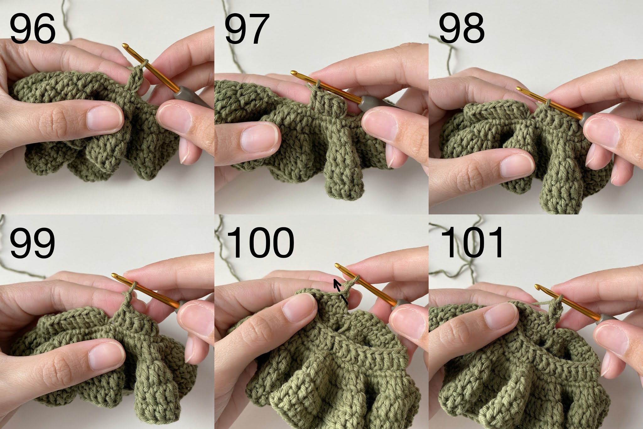 RND 26: (sc in next st, inc in next st, sc in next 8 st) * 2 times [22]